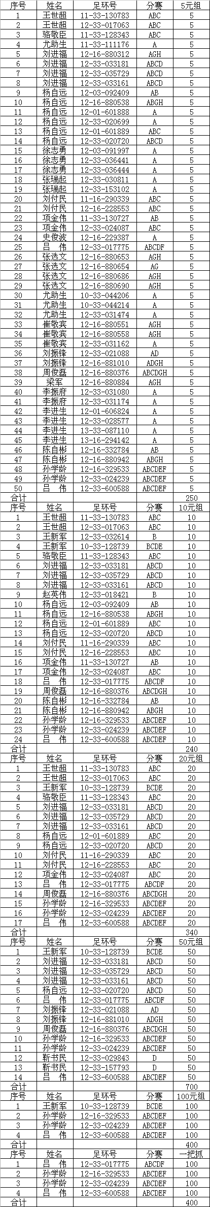 指定鸽参赛明细: